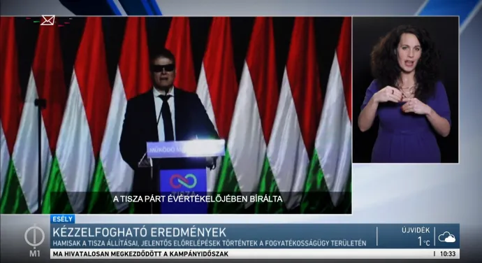 Kis kitekintő: a riport itt arra reagált, hogy dr. Kátai-Németh Vilmos, Budapest 09. számú választókerületének látássérült tiszás jelöltje azt mondta, hogy a kormány alá-fölé rendeltségi viszonyban kezeli a fogyatékkal élőket, nem pedig partnerként. A köztévé erre objektív közszolgálati jelleggel eléggé begurult, mert egy nagyon hosszú blokkot szánt arra, hogy egy MI-nek tűnő hanggal elmondja, ez nem igaz. A Tisza politikusát ebben a hosszú blokkban nem szólaltatta meg a közmédia, a blokkban a politikai ellenfele és kihívója, a fideszes Király Nóra már úgyis mindent elmondott helyette.