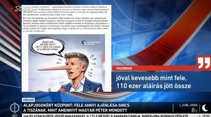 Orbán Viktor Facebook-posztjának, majd videójának bemutatása után azért bekerült pár másodpercben az is, ahogy Magyar Péter bejelenti, mind a 106 választókerületben meglett a kellő mennyiségű aláírás. Hogy a mérleg véletlen se billenjen túlságosan a Tisza felé, a köztévé újságírói precizitással bevágta azért ide Orbán Balázs posztját arról, hogy a Tisza veszélyes, összejátszik Ukrajnával, meg amúgy is, egy politikai lufi. Ahogy étkezés után a pálinka, úgy mosta le Magyar Péter nagyjából kilenc másodperces képernyőidejét (ennek a felében sétált) gyorsan azzal, hogy elmondták: a tét minden eddiginél nagyobb, háborús kockázat van, Orbán Viktor szerint pedig Magyar Péter nagyot állított. Maradt ezután még két blokknyi idő arra is, hogy elmondják a nézőknek: a Tisza hazudott, Magyar Péter láthatóan egy izzadó Pinokkió, és amúgy is, az ukránokkal van. Ezzel pedig szerkesztési értelemben meglett a közmédia aurea mediocritasa.
