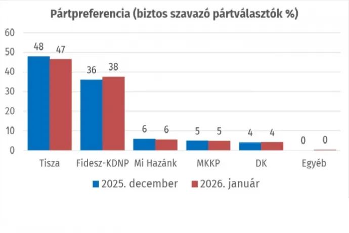 A biztos szavazó pártválasztók körében hibahatáron belül csökkent a Tisza előnye, miután 1 százalékpontot csökkent a Tisza, és 2 százalékpontot nőtt a Fidesz–KDNP népszerűsége, a Tisza előnye így 9 százalék.