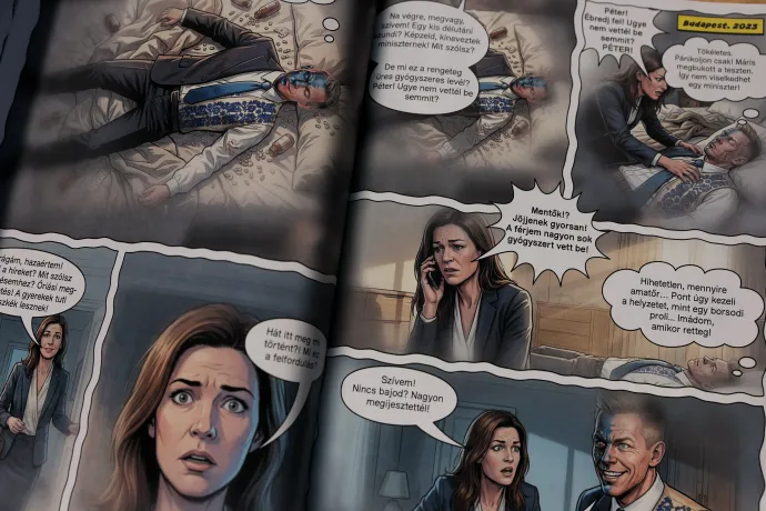 A képregényben Magyar Péter annyira berág, amiért nem őt, hanem Varga Juditot nevezik ki igazságügyi miniszternek, hogy bosszúból megpróbálja tönkre tenni a felesége életét. Öngyilkosságot színlel, késsel fenyegeti és válogatott sértéseket vág a fejéhez. Ezen a ponton kicsit elbizonytalanodtam, hogy mennyire vet jó fényt Varga Juditra, hogy a képregény szerint „vidéki tyúknak” és „borsodi egysejtű fakockának” nevezte Magyar Péter, aztán rájöttem, hogy a Fidesz eddig is aktívan használta a kegyelmi botrányba belebukott Vargát, egy képregény már nem oszt, nem szoroz. A kegyelmi botrány és Varga Judit abban játszott szerepe egyébként teljesen kimaradt a képregényből. Nagyjából az a sztori rajzolódik ki, hogy Magyar Péter a piszkos háttéralkuknak és a folyamatos hazudozásnak köszönhetően emelkedett fel. Nyilván.