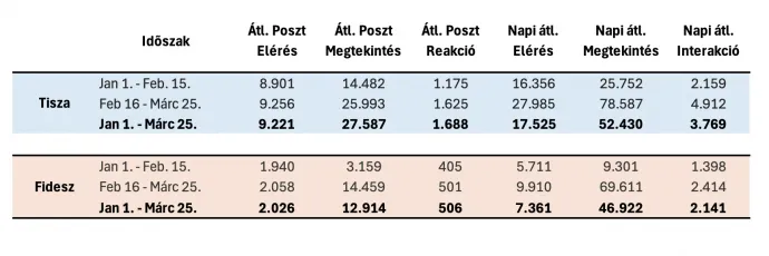 A Fidesz így valamelyest képes ellensúlyozni a posztonkénti rendkívül alacsonynak számító elérésszámait. Ebben a január 1. és február 15. közötti időszakban háromszoros volt a lemaradásuk, amit az azt követő hetekben (február 16. – március 25.) is csak minimálisan tudtak lefaragni. Ugyanakkor a napi átlagos aktív posztmegtekintés számban a korábbi 2,5-szeres lemaradást jelentősen tudták csökkenteni. Utóbbi adat kapcsán nagyon fontos hangsúlyozni, hogy abban jócskán szerepelhetnek duplikátumok, magyarán ha valaki egy napon több alkalommal is rákattint egy adott posztra (megnézi a Reels videót), az annyiszor szerepel ebben a kimutatásban, ahányszor csak megnyitja a tartalmat, éppen ezért a személyekre számított napi elérésszám sokkal jobban kifejezi azt, hogy valóban hány külön egyéni felhasználóhoz (választóhoz) értek el a különböző pártok üzenetei. Ez utóbbiban rosszabbul teljesít a Fidesz.