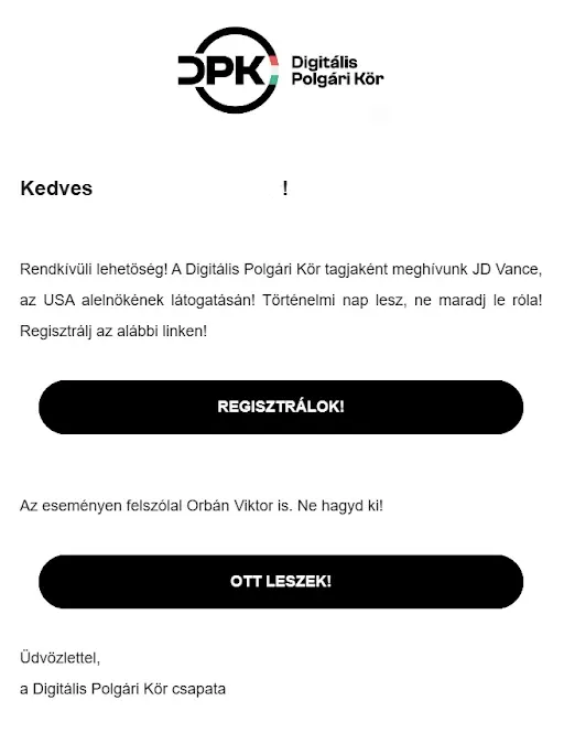 Erről tanúskodnak legalábbis azok a meghívók, amelyeket Húsvét hétfőn, délután a Digitális Polgári Körök tagjai kaptak emailben, és amik lapunkhoz is eljutottak. A meghívóban rendkívüli lehetőségként és történelmi napként hivatkoznak Vance érkezésére, amiről nem érdemes lemaradni, aztán a regisztrációs linkre mutató gomb alatt még külön kiemelik, hogy Orbán Viktor is felszólal majd, szóval tényleg nem érdemes kihagyni. A biztonság kedvéért ez alá egy másik, ugyanoda mutató gombot is elhelyeztek a levélben.