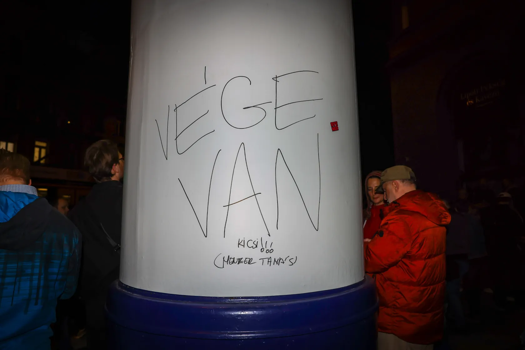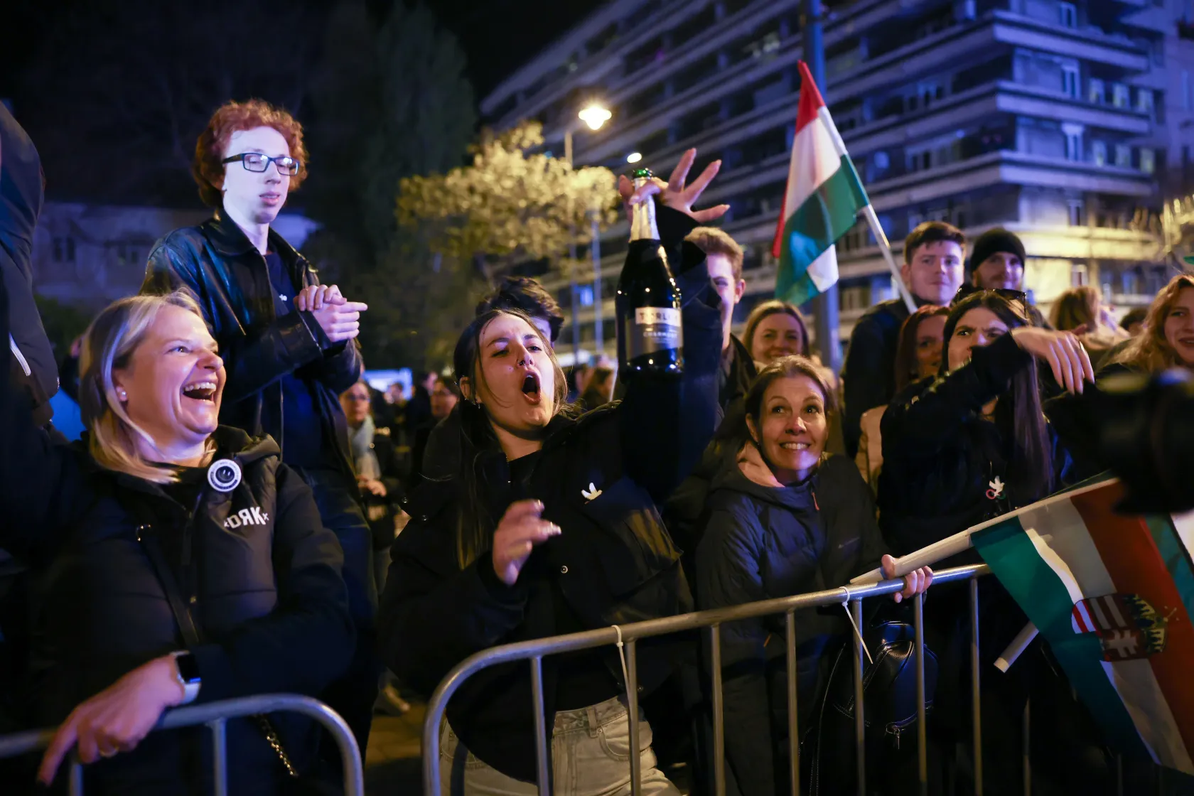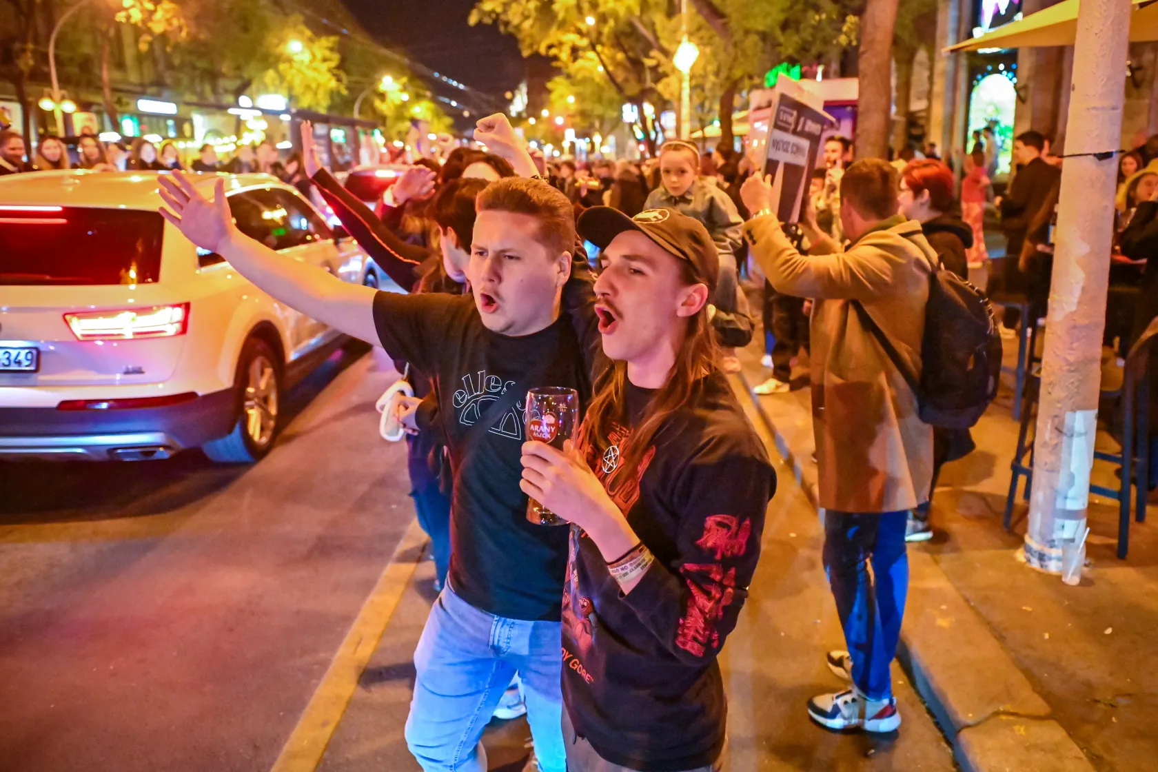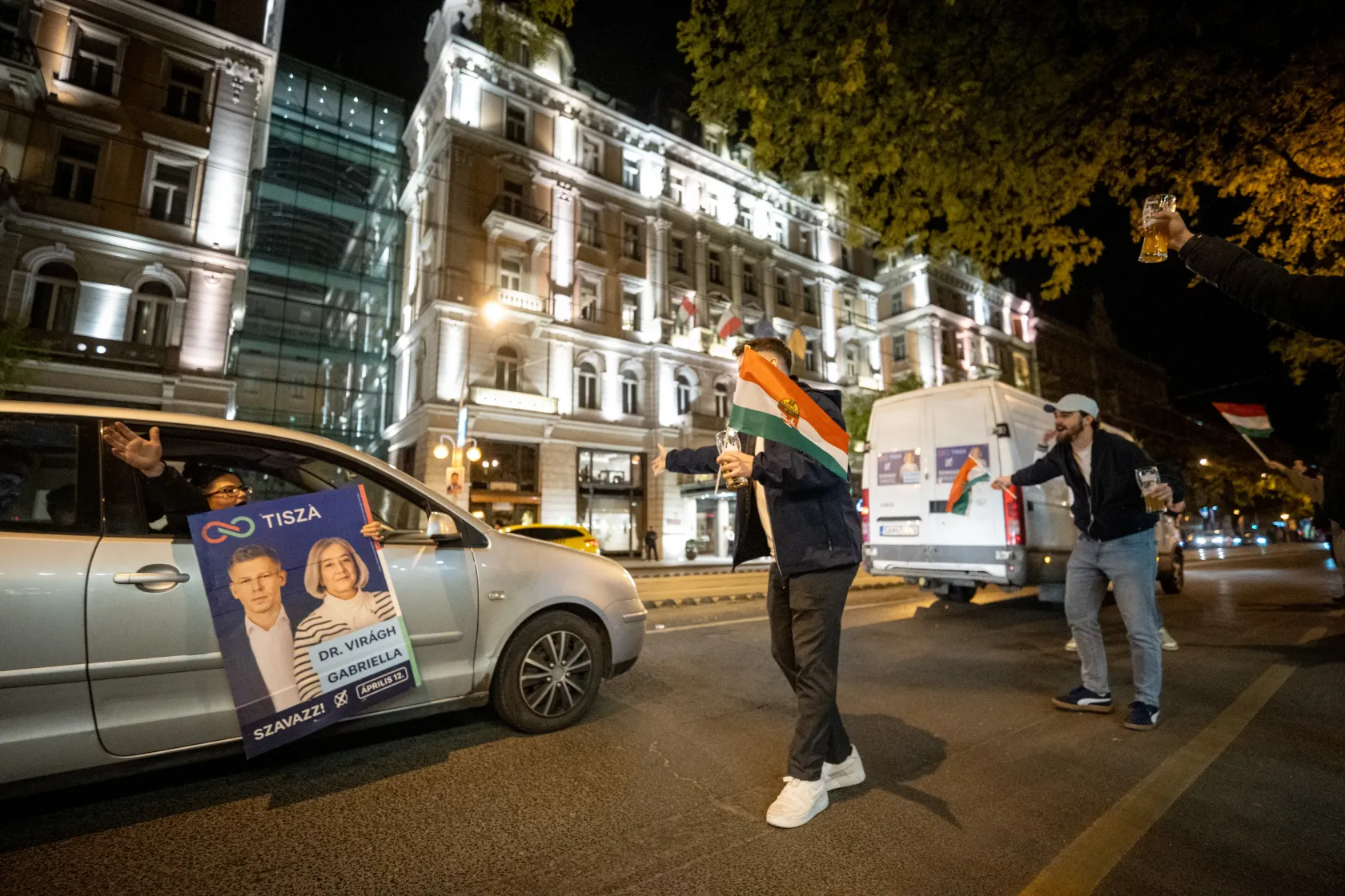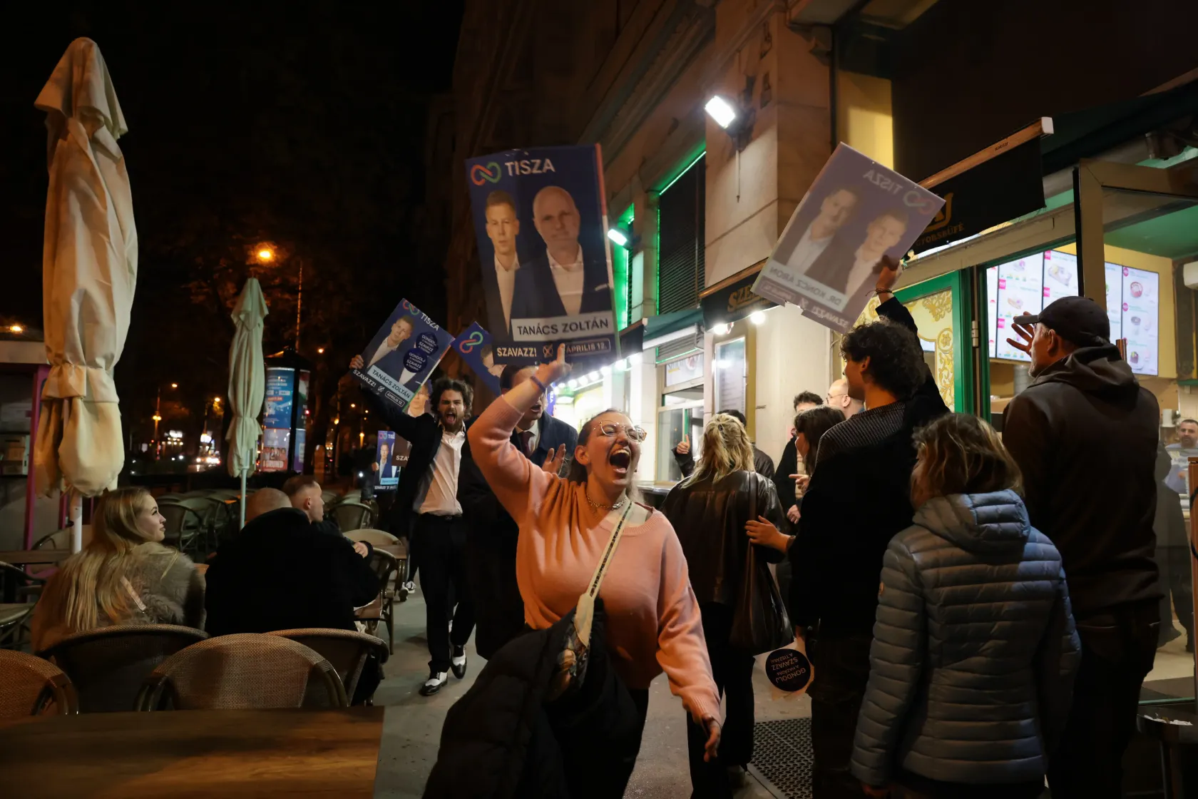 Élvezik a szabadságot, és reggelig isznak, mondja egy csapat fiatal. Mindegyikük egy-egy Tisza pártos választási plakátot szorongat a kezében. „Ma este ezzel alszunk” – állítják, de tovább nem tudunk beszélgetni, mert egy másik csapat fiatal sikongatva eltolja őket.