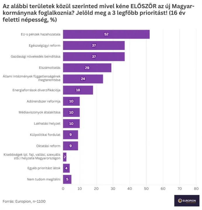 Egy másik kérdésben arra voltak kíváncsiak a kutató, miket tartanak a válaszadók az új kormány legfontosabb feladatainak. Legtöbben, a megkérdezettek több mint fele (52 százalék) az EU-s pénzek hazahozatalát jelölte meg, ezt az egészségügyi reform és a gazdasági növekedés beindítása követte (37-37 százalék). Érdekesség, hogy az egészségügyi reformot különösen a Mi Hazánk-szavazók (56 százalék) és a párthoz nem kötődők (50 százalék) választották, míg a gazdasági növekedés beindításának priorizálása inkább az idősebbek és a vidéki szavazók körében talált széleskörű támogatásra.
