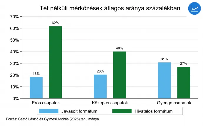 A tét nélküli mérkőzések valószínűsége szimulációval határozható meg: a válogatottak ereje múltbeli teljesítményük alapján viszonylag jól becsülhető az úgynevezett Élő-pontszámmal, ezek segítségével pedig előrejelezhető a csoportmérkőzések eredménye. Ahogy az ábrán látszik, a 16 legjobb csapat tét nélküli csoportmérkőzéseinek valószínűsége kevesebb mint harmadára csökkenthető a jelenlegi, átlagosan 60 százalék feletti értékről. A 16 közepes válogatottnál mintegy 50 százalékos javulás érhető el. A 16 leggyengébb csapatnál ugyan kissé romlik a mutató értéke, de ez nem meglepő, hiszen az általunk javasolt formátumban 32 helyett csak 24 csapat éli túl a csoportkört.