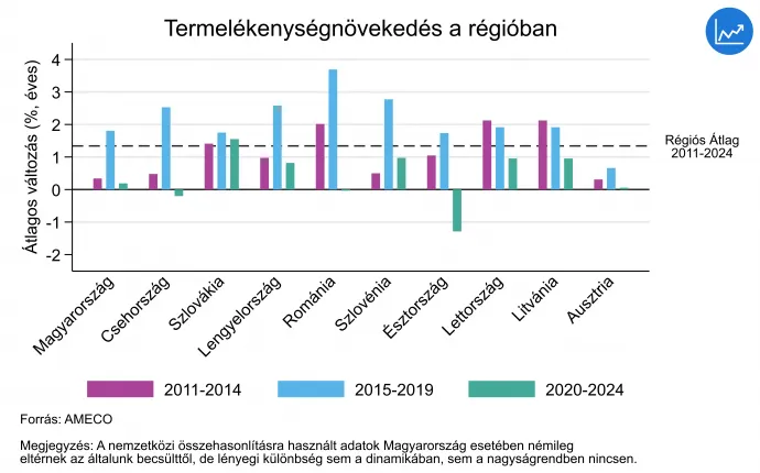A hosszú távú kilátásaink szempontjából a legfontosabb és egyben legbizonytalanabb feltevés a termelékenység alakulása. Ez a mutató nemcsak időszakról időszakra, hanem a közvetlen versenytársaink között is jelentősen szóródik. Minden időszakban igaz azonban, hogy Magyarország rendre a gyengébben teljesítők közé tartozott, ahogy azt bemutatjuk az első ábránkon. A termelékenységjavulás régiós átlaga az elmúlt 15 évben évi 1,3 százalék, a magyar pedig átlagosan 1 százalék volt. Így kifejezetten optimista feltevéssel élünk, amikor a következő években a magyar gazdaság évi 1,5 százalékos termelékenységjavulásával számolunk.