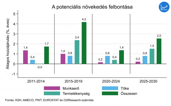 A fenti – hangsúlyozottan optimista – feltevések mellett a magyar gazdaság tartós növekedése a mindössze évi 2,5 százalékot érheti el. Ezt mutatjuk meg a második ábrán, ahol a fenti feltételezéseket összesítjük az előző cikkünkben bemutatott módszerrel. Egyszeri kilengések, ciklikus felfutások lehetnek persze, de hosszabb távon a 4 százalék feletti kormányzati célszámok nem tűnnek reálisnak.
