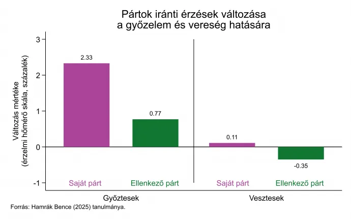 Az eredmények azt mutatják, hogy a választási vereség nem növelte a szavazók győztesek iránti ellenszenvét. Az ellenfél megítélése gyakorlatilag nem változott. Emellett a vesztesek nem távolodtak el a saját pártjuktól sem. A győztesek viszont kissé pozitívabban értékelték saját pártjukat, és kis mértékben még a vesztes párt iránti érzelmeik is javultak. Tehát a választások inkább a győztesek identitását erősítették, mintsem a vesztesek ellenszenvét növelték. Bár az ilyen szimulált helyzetekben adott reakciók eltérhetnek a valóságban tapasztalhatóktól, kutatásomban hasonló eredményeket találtam a valós amerikai választások után az elmúlt két évtized adataiban is.