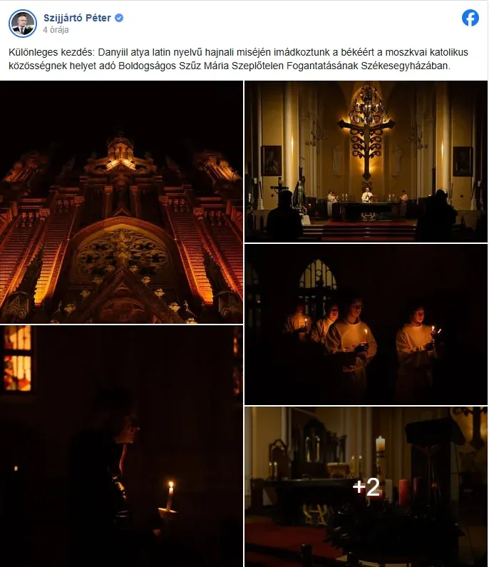 Early in the morning, Szijjártó posted on Facebook from Moscow that Father Danyiil had celebrated Mass and prayed for peace with part of the delegation at the Cathedral of the Immaculate Conception of the Blessed Virgin Mary, home to Moscow's Catholic community.