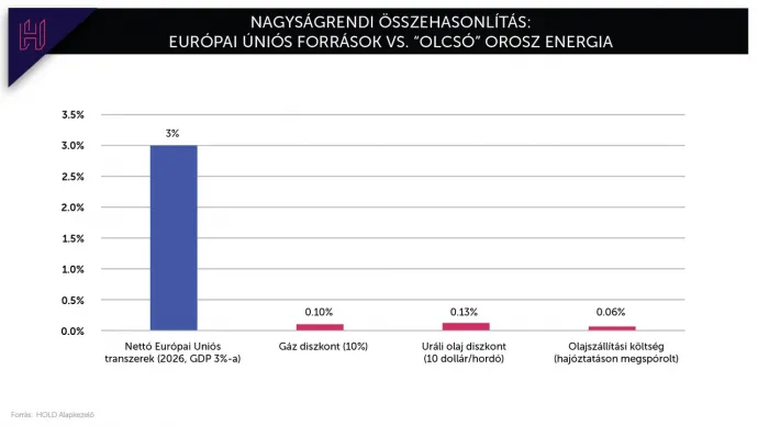 Ezeknek a forrásoknak kellene megérkezni a következő két-három évben, akár két-három százalékkal bővítve a magyar gazdaságot. Ehhez képest az orosz energián megspórolt pénz (amennyiben létezik) csupán alamizsnának vehető. Még nagyvonalú feltételezésekkel is legfeljebb a GDP néhány tizedszázalékáról beszélünk az orosz energiaoldalon, miközben az EU-források évi 2,5–3,5 százalékos támaszt adtak a magyar gazdaságnak.