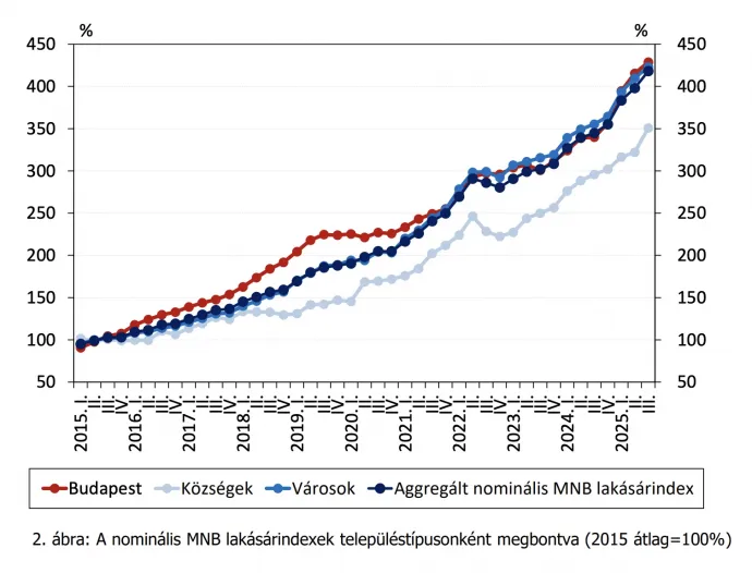 Megjelent az MNB statisztikája a 2025-ös harmadik negyedévi ingatlanpiaci folyamatokról, amiből már kiolvashatók az Otthon Start Program első hatásai. A lakásárak alakulását országos átlagban bemutató aggregált MNB lakásárindex alapján 2025 harmadik negyedévében negyedéves alapon 5 százalékkal nőttek a lakásárak a megelőző negyedévi 3,8 százalékos emelkedés után. Az éves nominális növekedési ütem az előző negyedévben megfigyelt 17,3 százalékról 21,3 százalékra gyorsult,