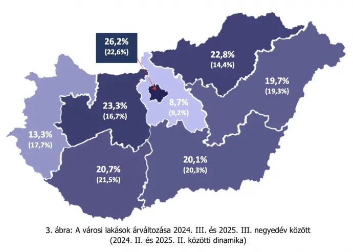 Közép-Dunántúlon 5,6 százalékkal, Dél-Dunántúlon 3,4 százalékkal, Észak-Alföldön pedig 3,0 százalékkal emelkedtek a városi lakásárak a harmadik negyedévben, Pest vármegye városaiban viszont relatíve mérsékeltebb, 1,5 százalékos áremelkedés valósult meg. Éves összevetésben a régiók többségében már a 20 százalékot is meghaladta lakásár-emelkedés, egyedül Pest vármegyében volt egy számjegyű (+8,7 százalék) a városi lakásár-dinamika, a legnagyobb éves áremelkedés (+23,3 százalék) pedig Közép-Dunántúl városaiban jelentkezett.
