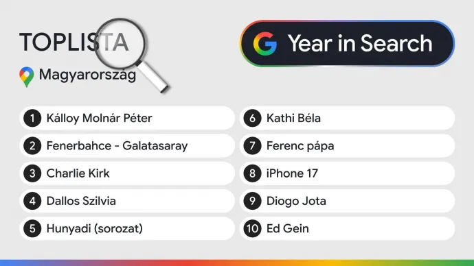 Idén is kiadta a Google, hogy mi érdekelte leginkább a magyar internetezőket az alapján, hogy mire kerestek rá a legtöbbször. Az abszolút toplistát Kálloy Molnár Péter színész vezeti, aki idén december 1-jén halt meg. A második helyre a török rangadó, a Fenerbahce és a Galatasaray futballcsapat meccse került, a harmadik legtöbb keresés pedig a szeptemberben meggyilkolt Charlie Kirk amerikai influenszer nevével indult.